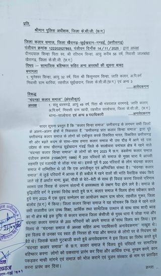 खैरागढ़/छुईखदान. जिला खैरागढ़-छुईखदान-गण्डई (KCG) के वनांचल क्षेत्रों में सामाजिक बहिष्कार और अमानवीय प्रताड़ना का एक रूह कंपा देने वाला मामला सामने आया है। 'छत्तीसगढ़ प्रांत कलार सिन्हा समाज' की मुख्यधारा में शामिल होने वाले लगभग 200 परिवारों को 'चंदनहा कलार समाज' के पदाधिकारियों द्वारा न केवल समाज से बहिष्कृत कर दिया गया है, बल्कि उनसे अवैध वसूली और मानसिक उत्पीड़न भी किया जा रहा है। मंगलवार को जिला अध्यक्ष दीनदयाल सिन्हा के नेतृत्व में बड़ी संख्या में समाज के पीड़ित लोगों ने कलेक्टर और पुलिस अधीक्षक कार्यालय पहुंचकर ज्ञापन सौंपकर दोषियों के खिलाफ कड़ी कार्रवाई की मांग की।