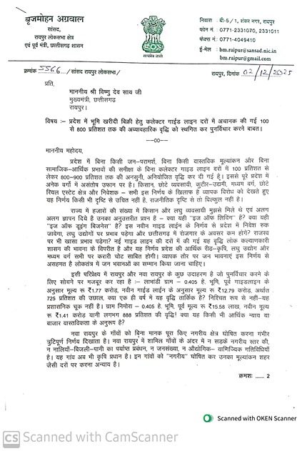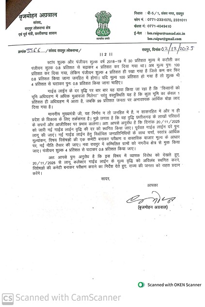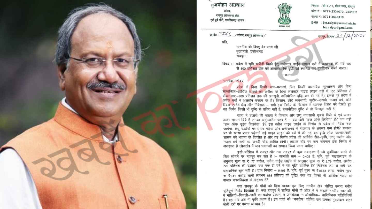 रायपुर. छत्तीसगढ़ में भूमि खरीद–बिक्री हेतु कलेक्टर गाइडलाइन दरों में की गई भारी वृद्धि के खिलाफ रायपुर लोकसभा सांसद और वरिष्ठ भाजपा नेता बृजमोहन अग्रवाल मुखर हो गए हैं। सांसद अग्रवाल ने मुख्यमंत्री विष्णुदेव साय को विस्तृत पत्र लिखकर इस निर्णय को तत्काल प्रभाव से स्थगित करने और पुनर्मूल्यांकन कराने की मांग की है।
