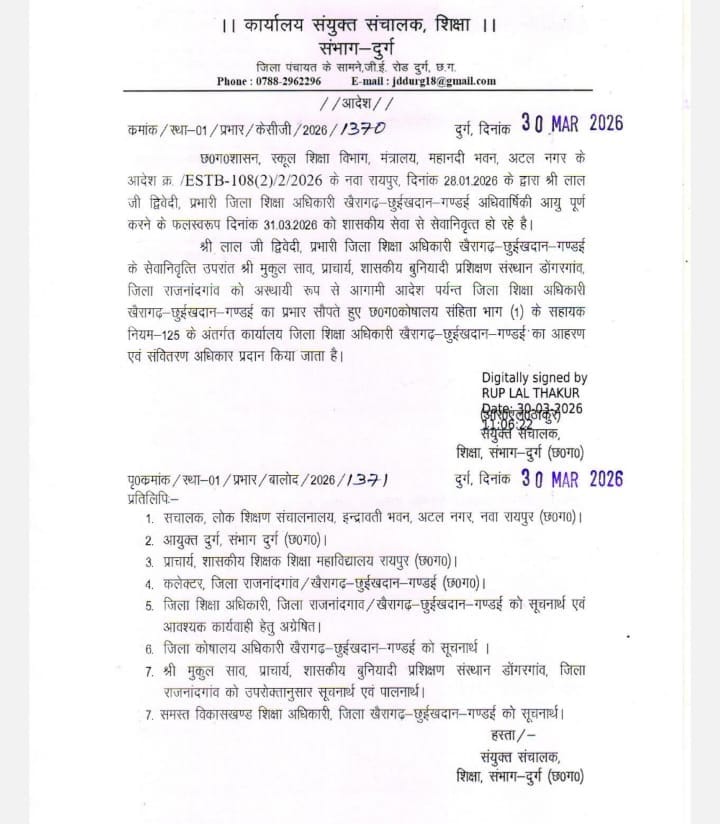 श्री द्विवेदी के सेवानिवृत्त होने के बाद विभागीय कार्यों की निरंतरता बनाए रखने के लिए शासन ने वैकल्पिक व्यवस्था भी सुनिश्चित कर दी है। जारी आदेश के अनुसार, राजनांदगांव जिले के डोंगरगांव स्थित शासकीय बुनियादी प्रशिक्षण संस्थान के प्राचार्य श्री मुकुल साव को अस्थायी रूप से खैरागढ़-छुईखदान-गण्डई जिले के जिला शिक्षा अधिकारी का प्रभार सौंपा गया है। यह व्यवस्था आगामी आदेश तक प्रभावी रहेगी।