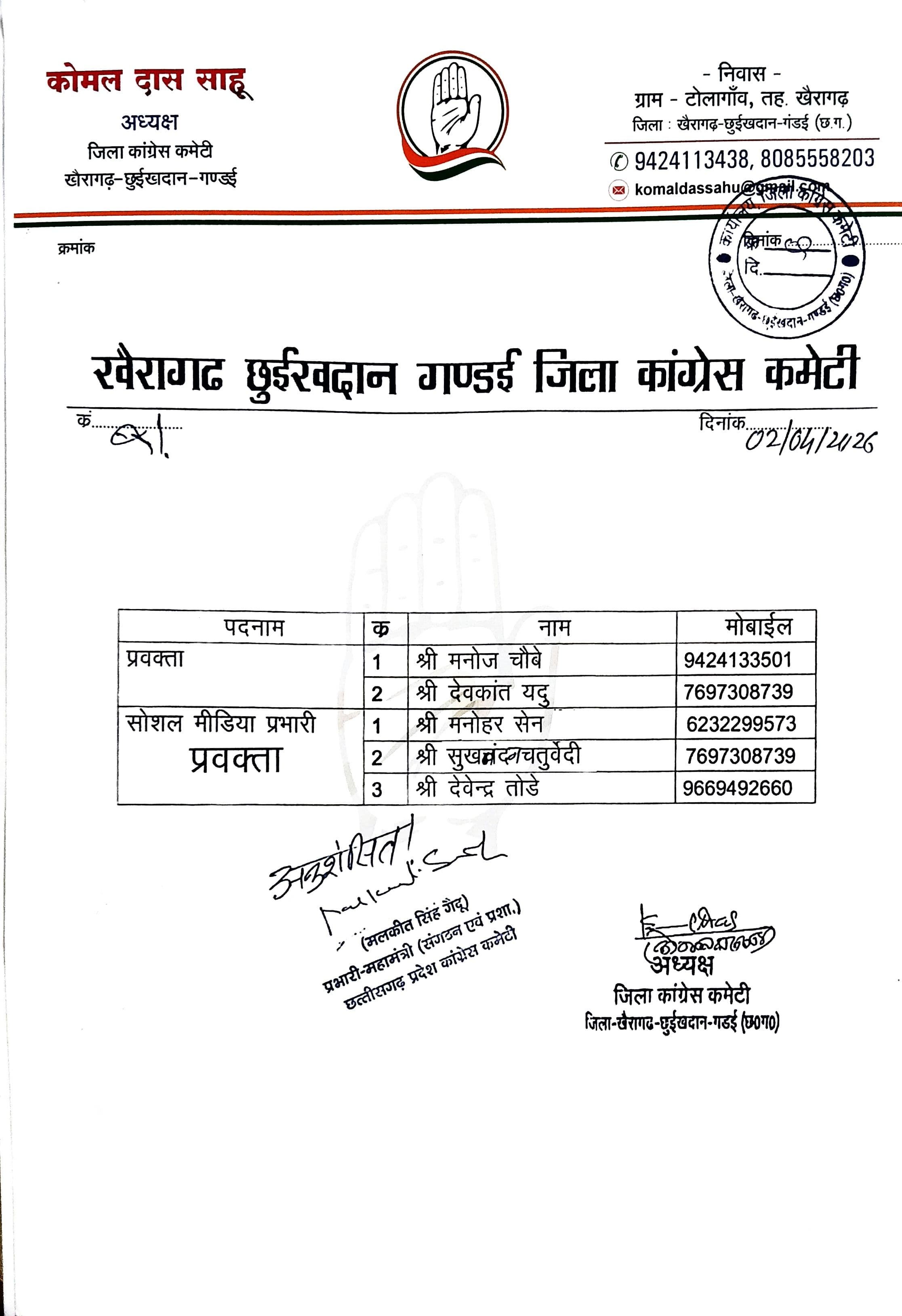 खैरागढ़. आगामी राजनीतिक चुनौतियों और संगठन विस्तार को देखते हुए जिला कांग्रेस कमेटी ने अपनी नई टीम में ऊर्जावान नेतृत्व को प्राथमिकता दी है। पार्टी ने युवा व तेज तर्रार नेता मनोहर सेन को जिला प्रवक्ता नियुक्त करने के साथ-साथ सोशल मीडिया प्रभारी जैसी महत्वपूर्ण दोहरी जिम्मेदारी सौंपी है। इस नियुक्ति को खैरागढ़ में कांग्रेस की आक्रामक संचार रणनीति के रूप में देखा जा रहा है।