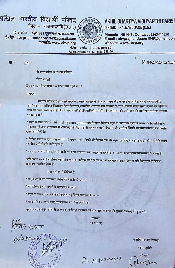 खैरागढ़. नगर की अव्यवस्थित यातायात व्यवस्था और लगातार बढ़ रही दुर्घटना संभावनाओं को देखते हुए अखिल भारतीय विद्यार्थी परिषद (ABVP) इकाई खैरागढ़ ने मंगलवार को ASP को ज्ञापन सौंपकर तत्काल सुधारात्मक कदम उठाने की मांग की।