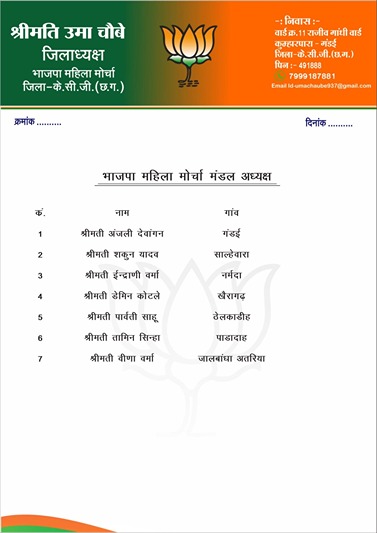 संगठन को मंडल स्तर पर मजबूत करने के लिए अंजली देवांगन (गंडई), शकुन यादव (साल्हेवारा), इन्द्राणी वर्मा (नर्मदा), देवीन कोठले (खैरागढ़), पार्वती साहू (ठेलकाडीह), तामिन सिन्हा (पाडादाह) एवं वीणा वर्मा (जालबांधा-अतरिया) को मंडल अध्यक्ष नियुक्त किया गया है।