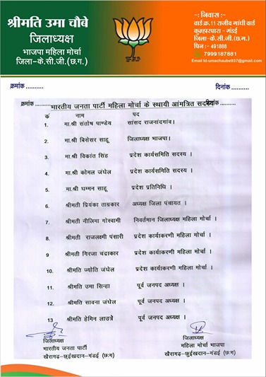 खबरों का प्रहरी न्यूज. भाजपा महिला मोर्चा केसीजी जिला संगठन का विस्तार, नवनिर्वाचित अध्यक्ष उमा चौबे ने घोषित की पूर्ण कार्यकारिणी